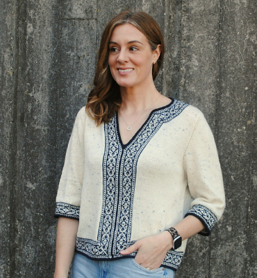 Петли для каждого рукава поднимаются вокруг проймы, и рукава вяжутся по кругу до длины в три четверти, при этом манжеты украшены жаккардовым узором. Вырез горловины, пояс и рукава отделаны краем в подгибку.