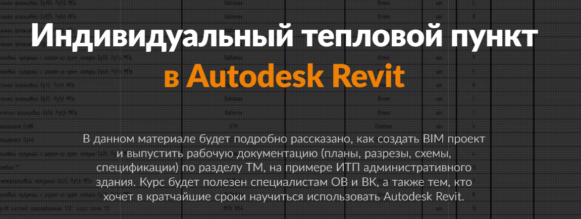 на примере ИТП административного здания. Курс будет специалистам ОВ и ВК, а также тем, кто хочет в кратчайшие сроки научиться использовать Autodesk Revit.