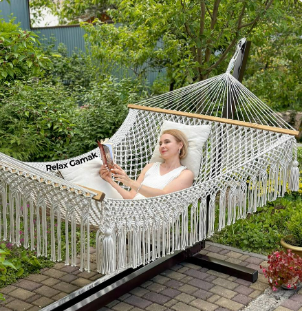 Гамак подходит для эксплуатации на улице. Шнур устойчив к воздействию ультрафиолета, не меняет своих качеств со временем и быстро сохнет при намокании. А каркас обработан маслом, которое защищает дерево от солнца и влаги.