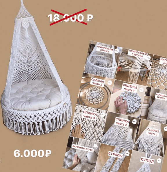 Итого, на идеальное подвесное кресло вы потратите 6.000 рублей и неделю работы. Неплохая цена цена за оригинальный предмет мебели, согласитесь. А вещи, сделанные своими руками, - бесценны и особо любимы. ⠀⠀⠀
