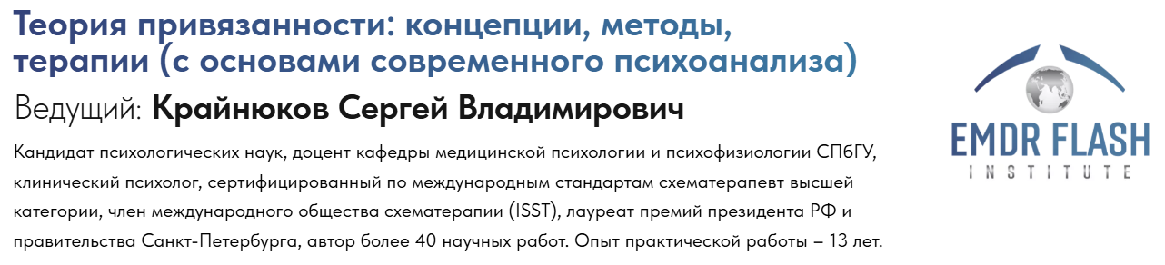 На предлагаемом курсе участники смогут узнать об основных идеях теории объектных отношений и теории привязанности, современных методах диагностики привязанности, а также методах терапии, основанной на привязанности.