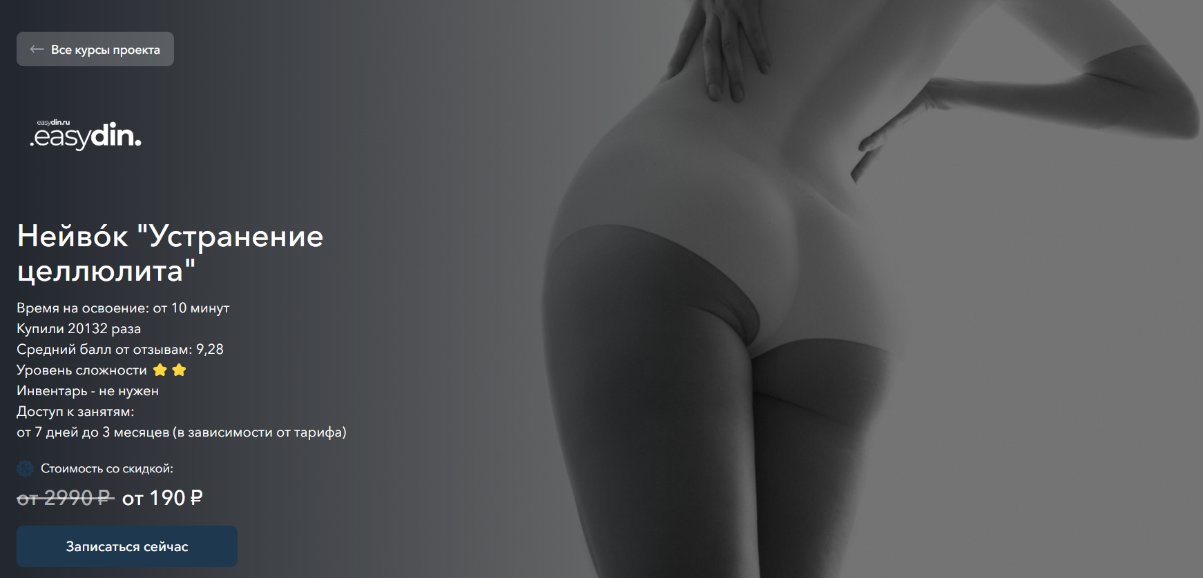 Время на освоение: от 10 минут <br>Купили 20132 раза <br>Средний балл от отзывам: 9,28 <br>Уровень сложности ⭐️⭐️ <br>Инвентарь - не нужен <br> Доступ к занятям на 6 месяцевeasydin.ru