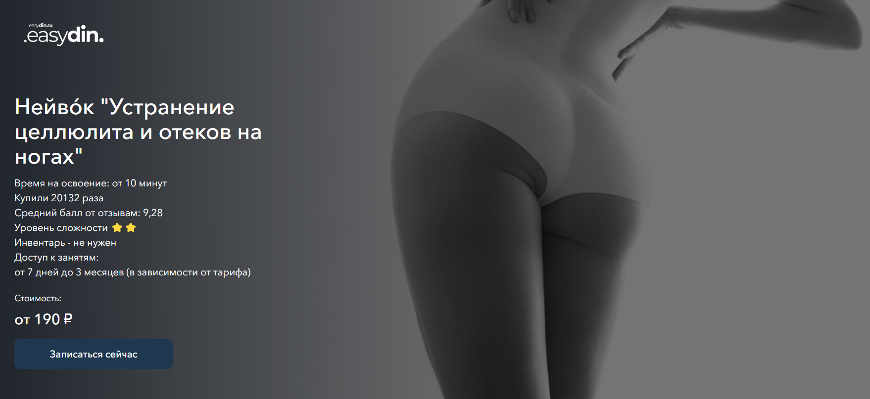 Время на освоение: от 10 минут <br>Купили 20132 раза <br>Средний балл от отзывам: 9,28 <br>Уровень сложности ⭐️⭐️ <br>Инвентарь - не нужен <br> Доступ к занятям на 6 месяцевeasydin.ru