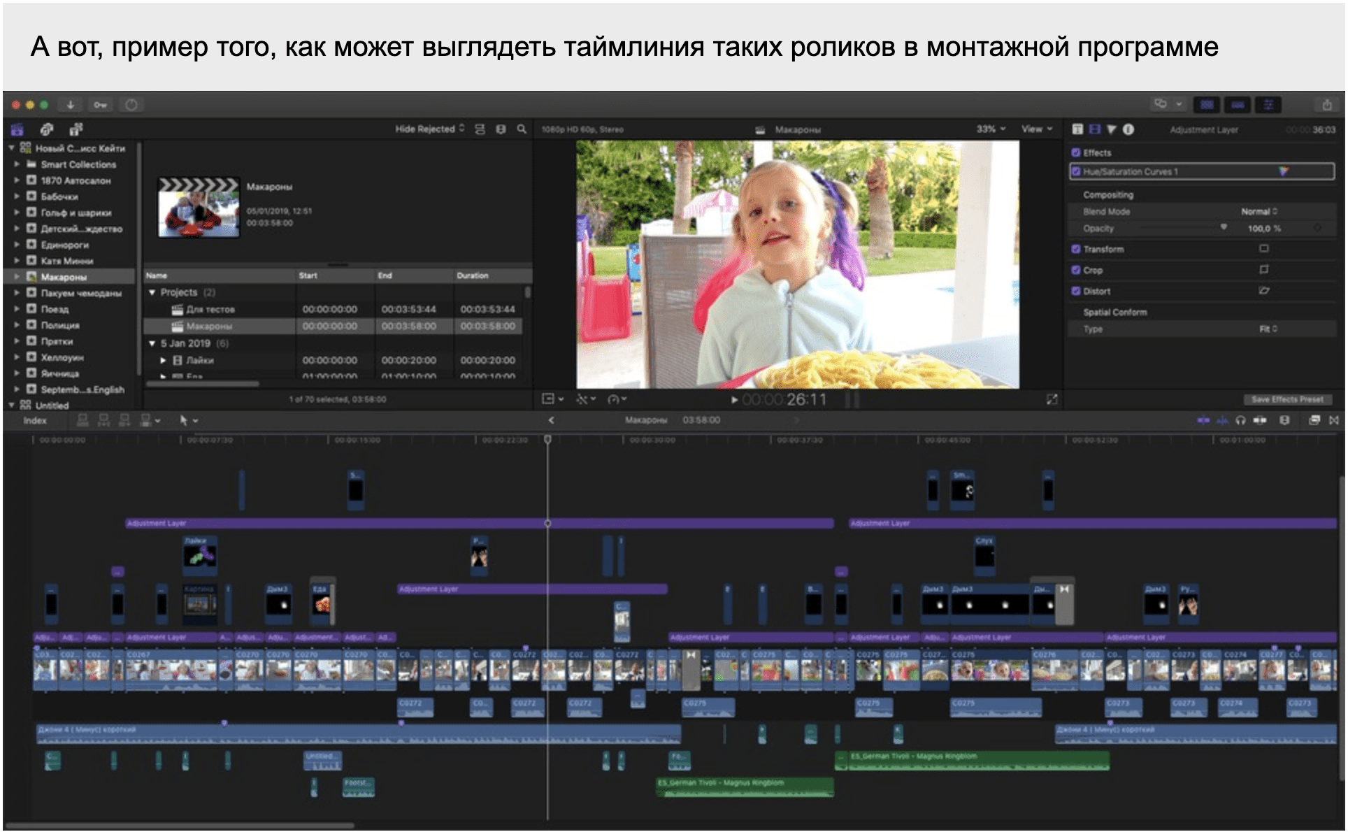 При создании роликов детской тематики требуется не только монтажная программа, но и программа для более удобной анимации и эффектов. Поэтому большое внимание в уроках уделено программе Apple Motion. Но ее изучение в курсе идет не максимально подробно и полно, а лишь на том уровне, который достаточен для создания роликов такого типа. Имейте это в виду. Кроме того, для работы с графикой понадобится программа Pixelmator. Уроки по ней, конечно, в курсе тоже имеются.