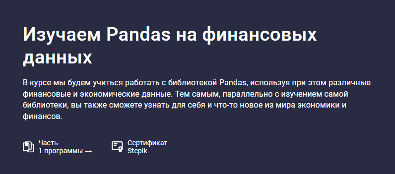 В курсе мы будем учиться работать с библиотекой Pandas, используя при этом различные финансовые и экономические данные. Тем самым, параллельно с изучением самой библиотеки, вы также сможете узнать для себя и что-то новое из мира экономики и финансов.stepik.org