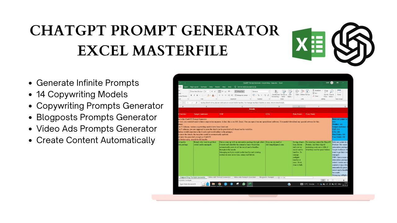 Этот генератор подсказок ChatGPT поставляется в формате MS. Мастер-файл Excel.