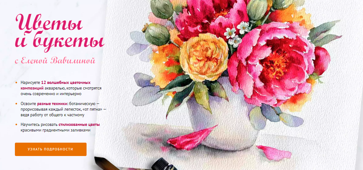 Хотите освоить разные техники: на курсе мы порисуем красивыми градиентными заливками, попробуем детально изображать каждый лепесток, а также освоим метод «от пятна», ведя работу от общего к частному.