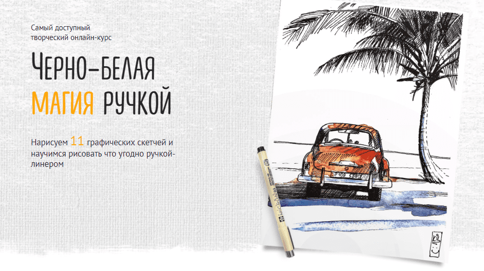 Большой творческий курс по графике «Черно-белая магия ручкой» — курс, в результате которого вы получите новые знания, освоите необычные техники рисования и создадите11 графических скетчей.