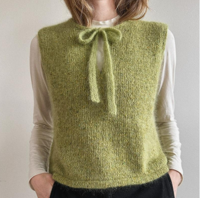 Название: Укороченная безрукавка с бантом на горловине Obsidian, вязанная спицами сверху (2025)