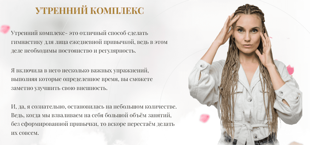 Утренний комплекс- это отличный способ сделать гимнастику для лица ежедневной привычкой, ведь в этом деле необходимы постоянство и регулярность.