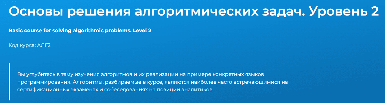 Изучение алгоритмов и их реализации на примере конкретных языков программирования, применяемых при написании расчетных и прикладных программ. Алгоритмы, разбираемые в курсе, являются наиболее часто встречающимися на сертификационных экзаменах и собеседованиях на позиции аналитиков.