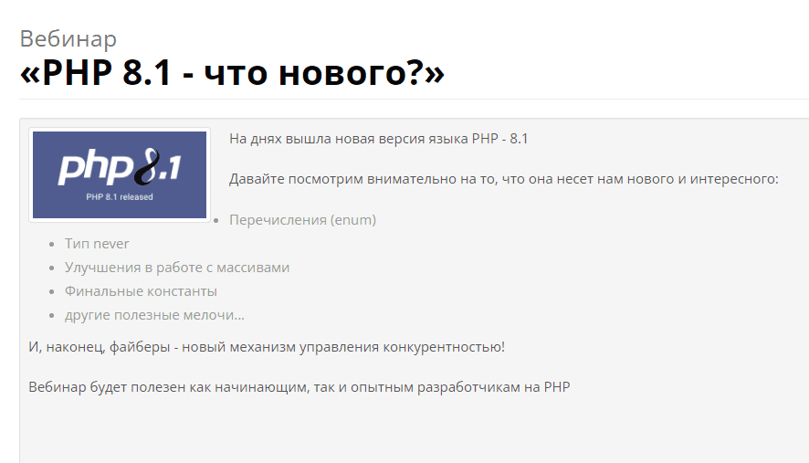 Скачать:Вебинар «PHP 8.1 - что нового?» | ProfIT - профессиональное обучение программированию. Курсы, интенсивы, вебинары, полный цикл обучения. От новичков до профессионалов.