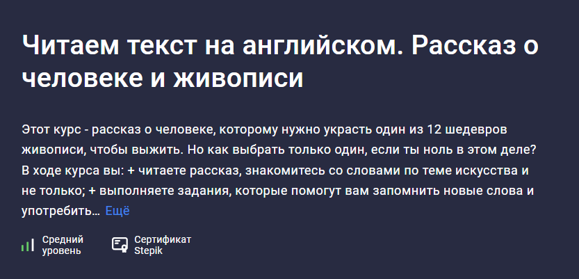 Этот курс - рассказ о человеке, которому нужно украсть один из 12 шедевров живописи, чтобы выжить. Но как выбрать только один, если ты ноль в этом деле? В ходе курса вы: + читаете рассказ, знакомитесь со словами по теме искусства и не только; + выполняете задания, которые помогут вам запомнить...stepik.org