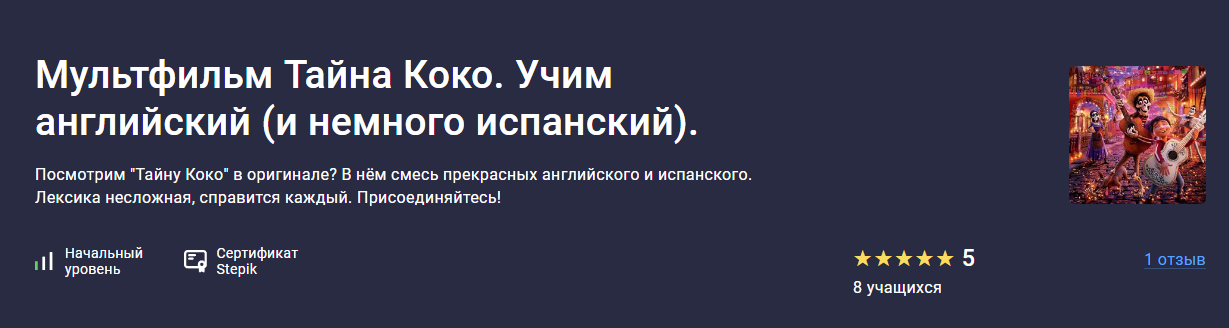 Курс предлагает возможность посмотреть мультфильм "Тайна Коко" в оригинале (на английском и испанском языках), услышать и выучить множество интересных фраз, которые вы сможете применять в речи.