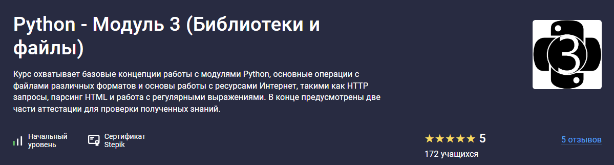 Курс охватывает базовые концепции работы с модулями Python, основные операции с файлами различных форматов и основы работы с ресурсами Интернет, такими как HTTP запросы, парсинг HTML и работа с регулярными выражениями. В конце предусмотрены две части аттестации для проверки полученных знаний.stepik.org