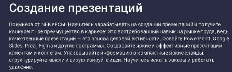 Премьера от NEКУРСЫ! Научитесь зарабатывать на создании презентаций и получите конкурентное преимущество в карьере! Это востребованный навык на рынке труда, ведь качественные презентации — это основа деловой активности. Освойте PowerPoint, Google Slides, Prezi, Figma и другие программы. Создавайте яркие и эффективные презентации клиентам и коллегам. Упаковывайте информацию в компактные яркие слайды, структурируйте мысли и визуализируйте идеи. Научитесь искать заказы и работать удалённо.