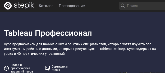 Курс предназначен для начинающих и опытных специалистов, которые хотят изучить все инструменты работы с данными, которые присутствуют в Tableau Desktop. Курс содержит 54 урока и 40 практических упражненийstepik.org