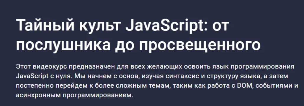 Курс "Тайный культ JavaScript: от послушника до просвещенного" предлагает увлекательное путешествие в мир веб-разработки, где каждый участник станет не только зрителем, но и активным создателем. Мы начнем с основ, постепенно погружаясь в захватывающий мир программирования, который открывает перед вами бескрайние возможности.