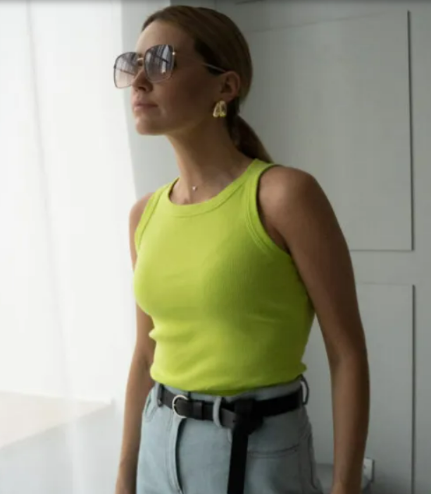 Выкройка майки-топа малого объёма, плотно прилегающего силуэта из трикотажного материала. Топ с классическим круглым вырезом горловины, широкими проймами на бретелях. Горловина проймы изделия обработаны обтачкой. Длина основного изделия выше линии бёдер.