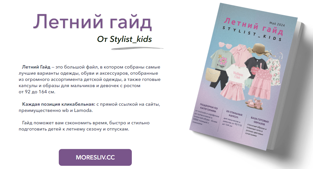 Летний Гайд — это большой файл, в котором собраны самые лучшие варианты одежды, обуви и аксессуаров, отобранные из огромного ассортимента детской одежды, а также готовые капсулы и образы для мальчиков и девочек с ростом от 92 до 164 см.