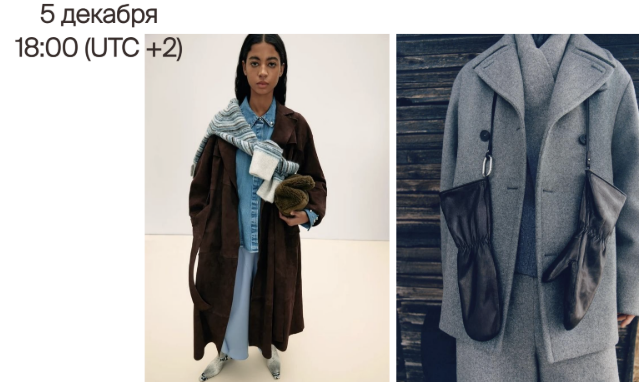 В вебинаре участвуют вещи из разных ценовых сегментов: начиная от более качественного масс-маркета (Massimo Dutti, Arket, Cos и т.д.) и локальных европейских брендов, до мидл-сегмента, и приправленные люксом.