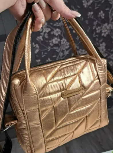 Сумочка сшита из ткани Дюспо, под названием "розовое золото" в реальности она золото, но с розовым оттенком. Камера никак не хочет передавать реальный цвет.