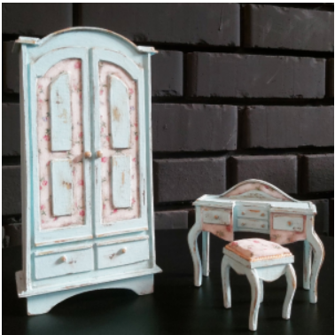 На МК вы сделаете три уникальных предмета: стильный шкаф высотой 22 см, изысканный туалетный столик высотой 9 см и мягкий пуфик высотой 5 см. Каждый из них будет носить в себе чарующую атмосферу французского стиля.