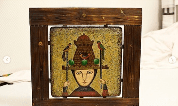 Изображение наносится на дерево (в центре картины дерево, которое обтачивается рашпилем вручную- это не сложно), рама также изготавливается вручную. Дерево - обычная сосна, купленное в обычном строительном магазинчике.