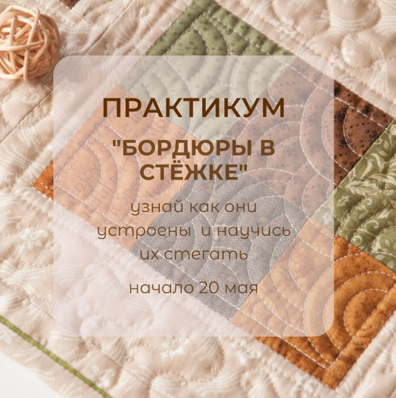 На практикуме "Бордюры в стëжке" я расскажу про многообразие бордюров, покажу, что их можно классифицировать, можно объединять в группы по общим признакам. Зная это, вы сможете сочинять свои рисунки бордюров, создавая уникальный и оригинальный квилт!
