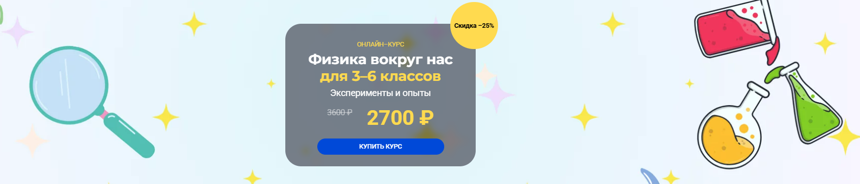 Курс подойдёт для тех ребят, которым уже интересна физика, и которые хотят больше в нее погрузиться. Можно ребятам и без опыта, приветствуется уверенная математика у 3–6 классов. Остальное всё расскажем, научим и влюбим в физику!