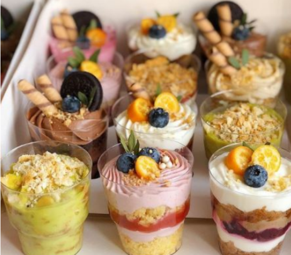 - Апельсиновый трайфл с клубникой, апельсиновым кексом и клубничным ганашем с сыром.