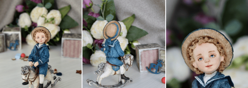 Малыш, которого мы будем делать на мастер классе, будто-бы позирует для фото. Он одет в костюм, очень модный в 19 веке, сидит на лошадке-качалке, любимой игрушке мальчишек того времени. Такая игрушка станет прекрасным украшением любой елочки.