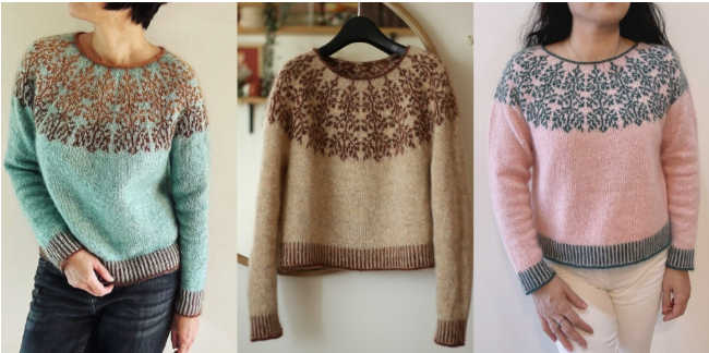 Автор модели вязала пуловер из тонкой шерстяной пряжи Nutiden, Honer Och Eir (100% шерсть; 500 м в 100 г), сложенной вместе с нитью мохера на шелке Le Petit Silk & Mohair, Biches & Bûches (30% шелк, 70% мохер; 210 м в 25 г).
