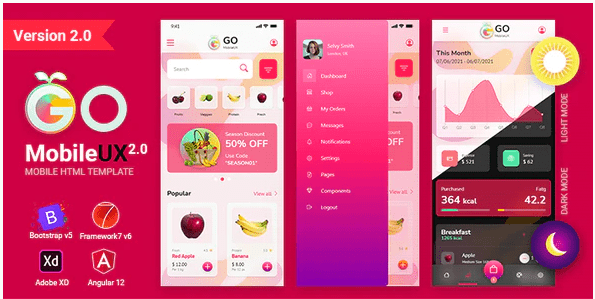 Многоцелевой шаблон GoMobileUX - это шаблоны HTML, CSS и js. Bootstrap версии 5.0.x мобильная первая платформа HTML / js и Framework7 v6.0 вместе со стартовым комплектом Angular 12 UI. Мы предлагаем широкий спектр индивидуальных, уникальных творческих и гибких компонентов. Мы также расширяем библиотеку компонентов с виджетами и другими сторонними настройками. Мы также стремимся создать множество других демонстрационных страниц приложений для наших клиентов, чтобы они могли легко получить готовый код html-страниц, удовлетворяющий требованиям. Теперь вы можете увидеть предварительный просмотр панели управления, статистики, профиля, магазина, корзины и других страниц.