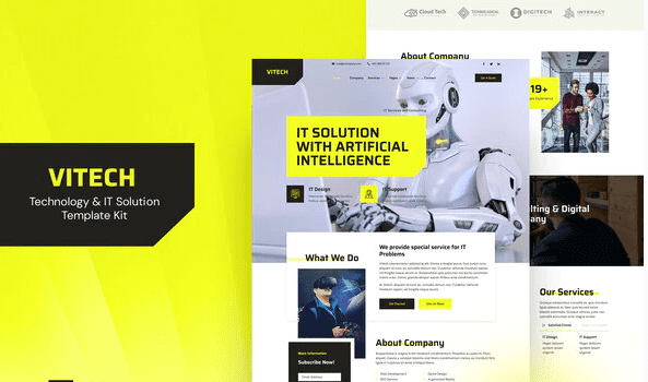 Vitech - это современный и чистый комплект шаблонов Elementor для создания отзывчивого и полнофункционального сайта на базе WordPress для технологического стартапа, цифрового агентства, виртуальной реальности, дополненной реальности, IT-услуг, программного решения или любого бизнеса, связанного с технологиями, без единой строчки кода!