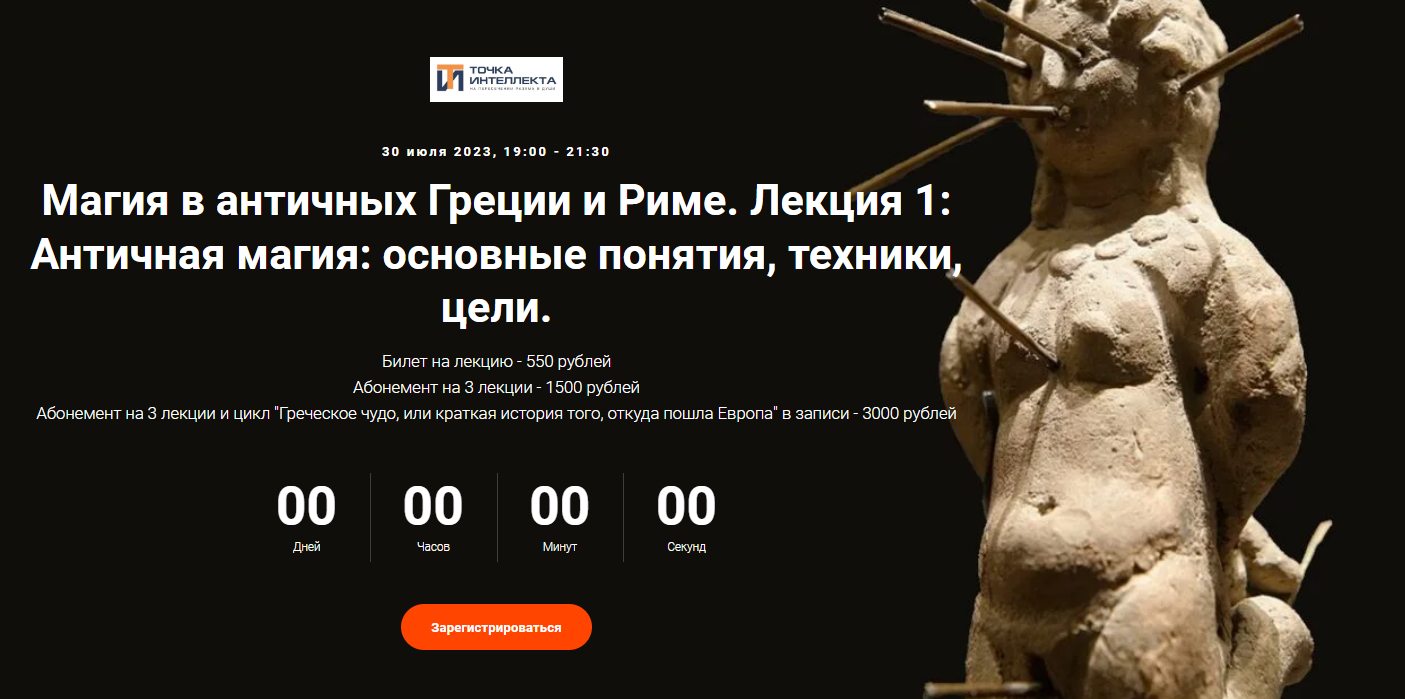 Курс будет посвящен характерным чертам магии в греко-римском мире, сохранившимся артефактам и свидетельствам о ней, истории ее эволюции. История магии – это и история самосознания человека, как это ни парадоксально звучит в современном мире. Вместе с «техниками» изменялись представления о богах...www.intpointclub.ru