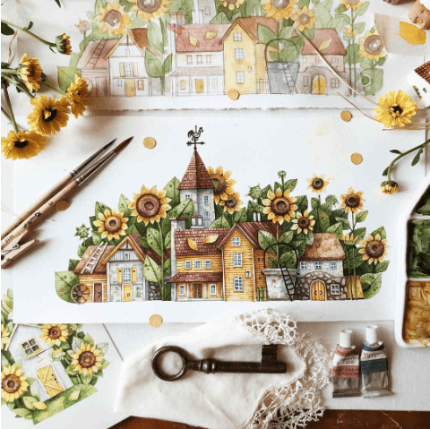 Рисовать цветы и домики любимое занятие Автора, что может быть лучше? Только нарисовать целую улицу в цветущем саду!