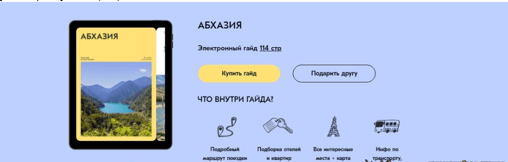 Он состоит из прогулок по Гагре, Пицунде, Новому Афону, Сухуму. Тебя ждёт встреча с озером Рица и другими горными озерами, водопадами, каньонами. Увидишь загадочные места — заброшенную ГЭС, поросший самшитом мост, подвесные качели на берегу моря. Подборка крутых мест проживания — отели и апартаменты на любой вкус и бюджет с шикарными видами. Списки всех интересных мест, рекомендации по сезону, по выбору подарков. Практическая информация, как перемещаться, где лучше жить, куда сходить поесть, интерактивная карта, бюджет поездки.