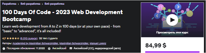 Этот курс научит вас веб-разработке с нуля, и благодаря «100 Days Of Code Challenge», который включен в этот курс (хотя это необязательно!), вы можете стать веб-разработчиком за 100 дней с помощью этого курса!