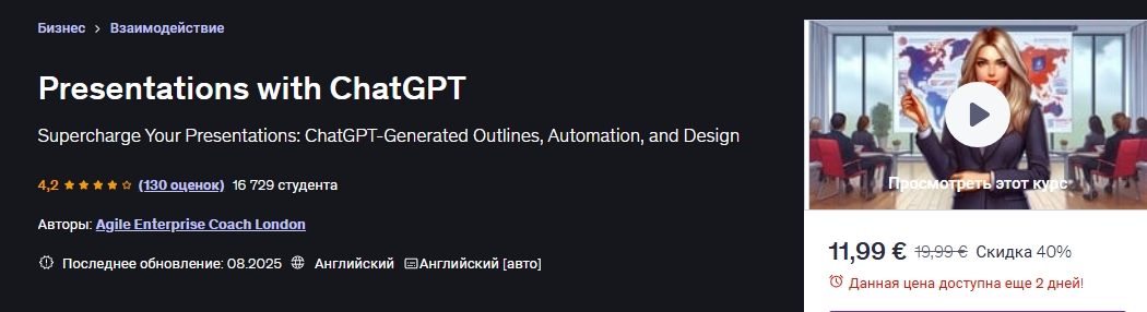 Этот курс состоит из тщательно структурированных лекций в форме пошагового руководства по созданию презентаций с помощью ChatGPT:
