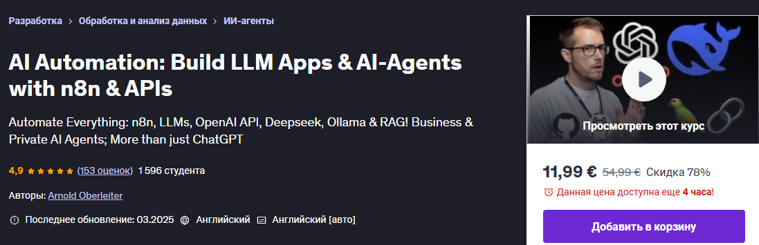 [Udemy] [Arnold Oberleiter] [ENG] ИИ-автоматизация: Создай LLM приложение & ИИ-агентов с помощью n8n & API (2025)