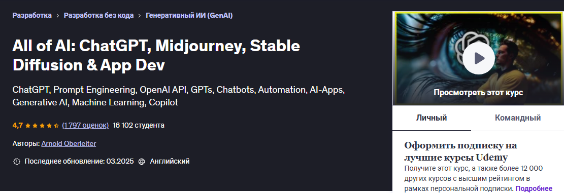 [Udemy][Arnold Oberleiter] Все об искусственном интеллекте: ChatGPT, Mid journey, Stable Diffusion и разработка приложений (2025)