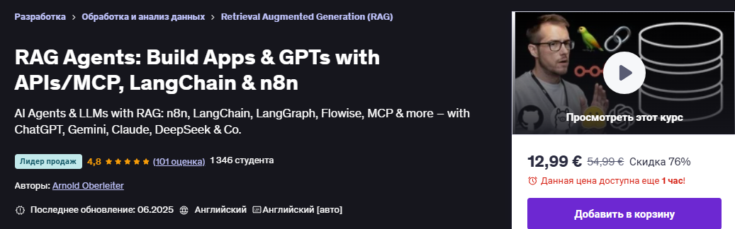 [Арнольд Оберлейтер] [Udemy] Агенты RAG: создание приложений и GPT с API/MCP, LangChain и n8n (2025)