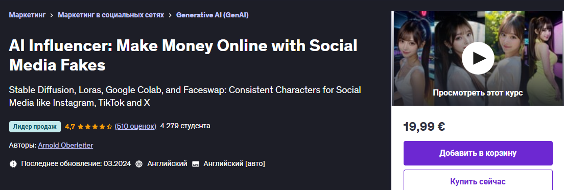 Слив курса AI Influencer: Зарабатывайте денежные средства в Интернете с помощью фейков в социальных сетях [Udemy] [Арнольд Оберлейтер]