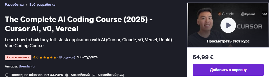[Udemy] [Brendan Li] [ENG] Полноценный курс ИИ программист с помощью Cursor AI, v0, Vercel (2025)