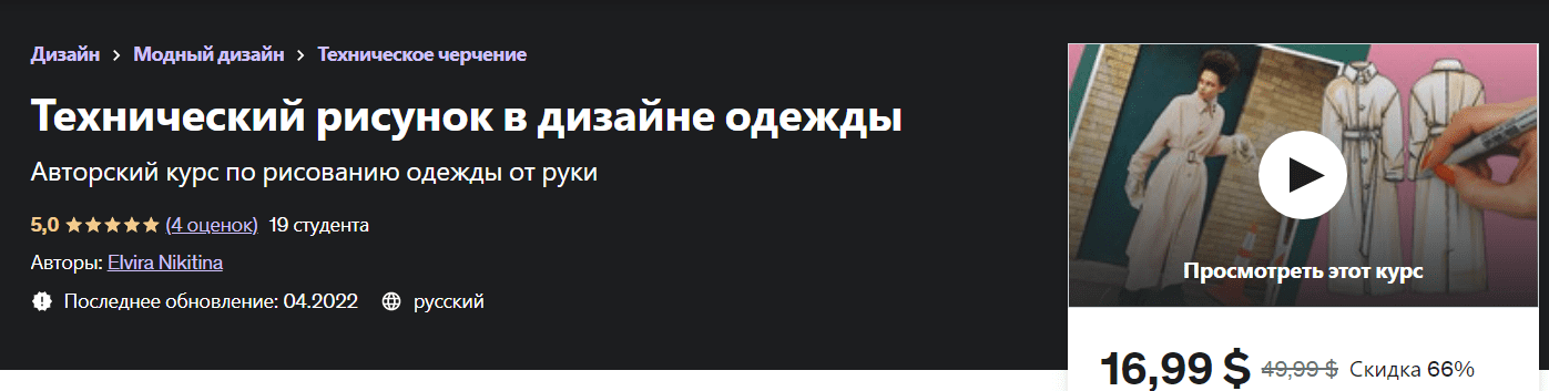 В этом авторском курсе я предлагаю необычные методы оформления технического рисунка. Мы научимся изображать простые формы (платья, жакеты, тренчи), модели со складками и драпировками, поработаем с фактурами и принтами. После курса вы сможете визуализировать любые свои идеи и создавать коллекции «на бумаге». Это значительно упростит работу с производством или заказчиком. Кроме того, рисование развивает насмотренность и креативность, и вы получите истинное удовольствие от процесса.