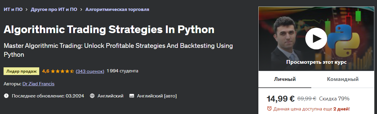 Будь вы опытный разработчик или новичок в кодировании, этот курс дает ценные идеи, практические знания и четкую дорожную карту для овладения алгоритмической торговлей на Python. Сделайте следующий шаг в своем торговом путешествии и зарегистрируйтесь сейчас!