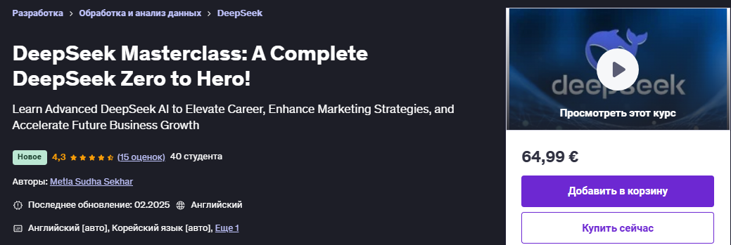 Откройте для себя мощь DeepSeek, передовой платформы ИИ, которая производит революцию в принятии решений , автоматизирует процессы и предоставляет действенные идеи. Этот всеобъемлющий мастер-класс призван провести вас от полного новичка до эксперта DeepSeek, вооружив вас навыками использования ИИ для повышения производительности, анализа данных и бизнес-аналитики . Независимо от того, являетесь ли вы бизнес-профессионалом, разработчиком программного обеспечения или энтузиастом ИИ, этот курс DeepSeek Masterclass: A Complete DeepSeek Zero to Hero! предоставит вам знания и практический опыт для максимального раскрытия потенциала DeepSeek.