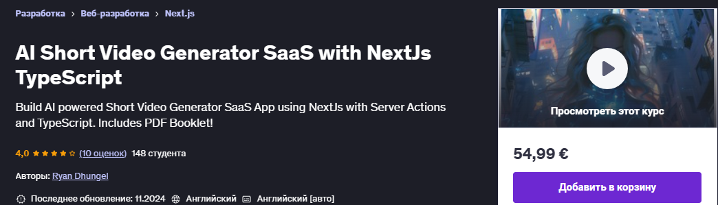 Название: ИИ генератор коротких видеороликов SaaS с NextJs TypeScript (2025)