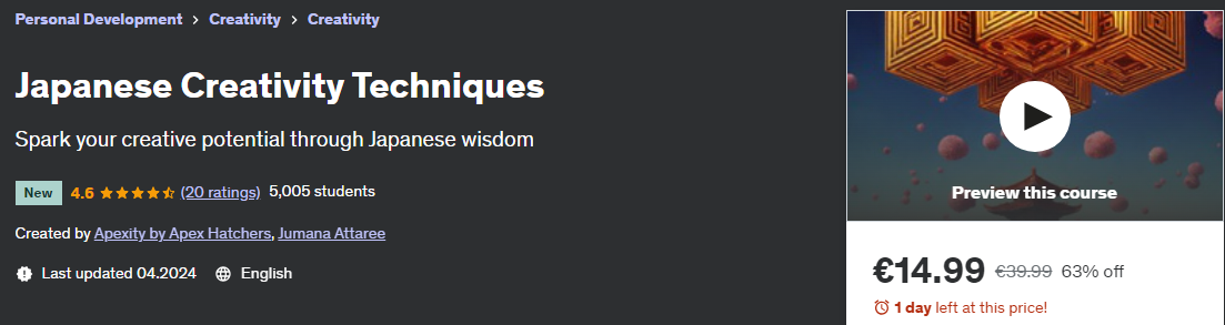 Этот всеобъемлющий курс основан на многовековой японской мудрости и помогает раскрыть творческий потенциал, внимательность и самообладание. Студенты получат мощные основы и методы, основанные на таких традициях, как дзэн, учение самураев, эстетика и мастерство.